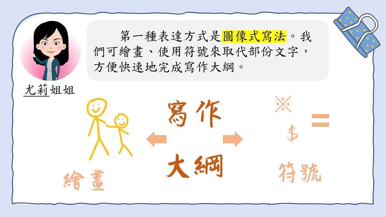 第一種表達方式是圖像式寫法。我們可繪畫、使用符號來取代部份文字,方便快速地完成寫作大綱。
