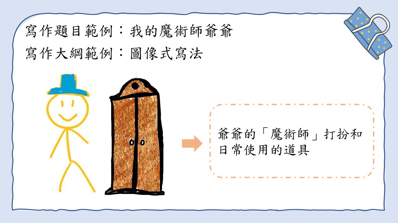 我們可以用簡單圖像來畫出爺爺的「魔術師」打扮和日常使用的道具。這種做法,除了省時,還能引起同學對撰寫「寫作大綱」的興趣;也能讓同學不再抗拒寫作,多作其他嘗試呢!