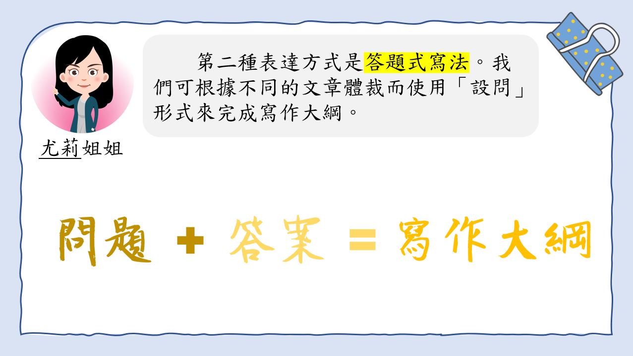 我們可根據不同的文章體裁而使用「設問」形式來完成寫作大綱。