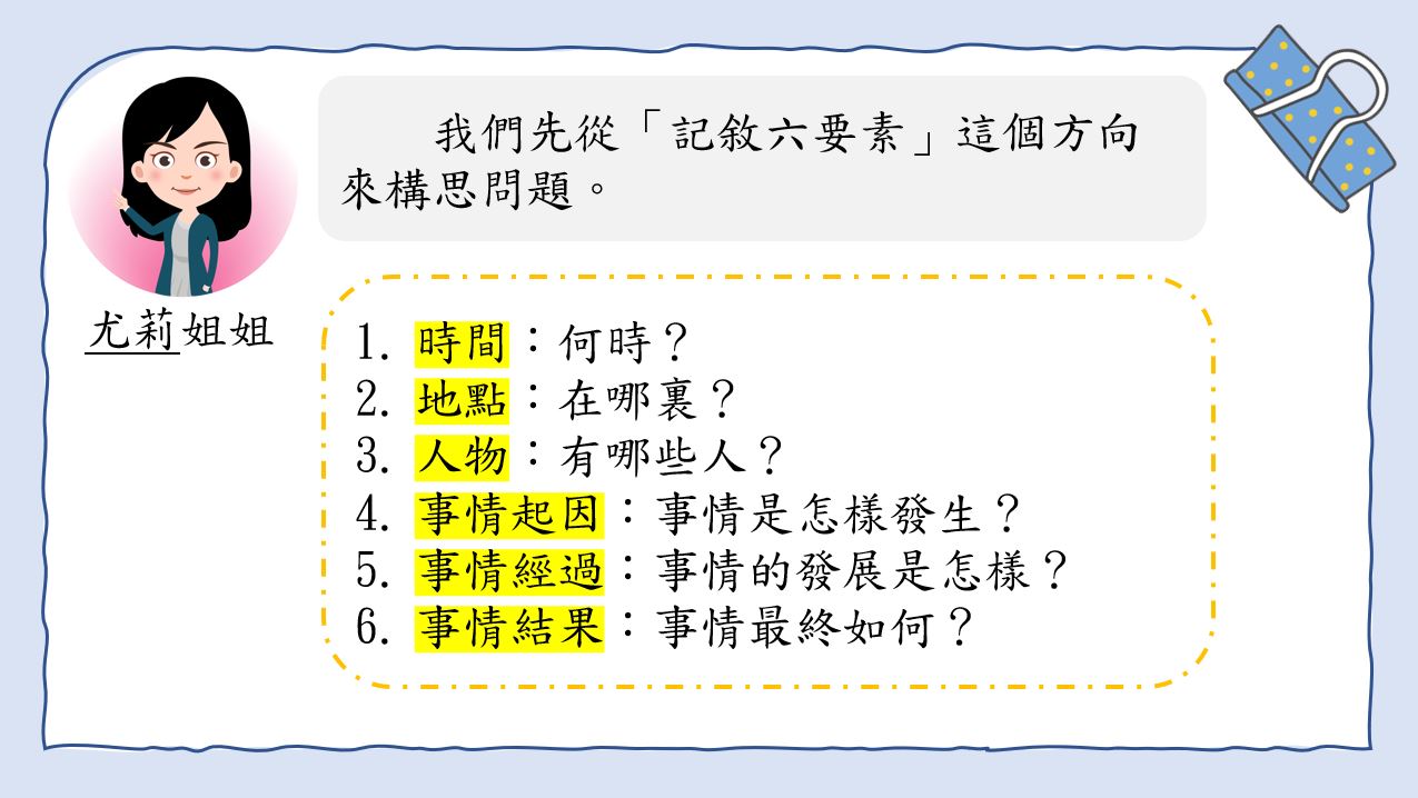 假如我們要寫一篇記敘文,就要以記敘文的特點來擬定問題。同學們還記得「記敘六要素」嗎?