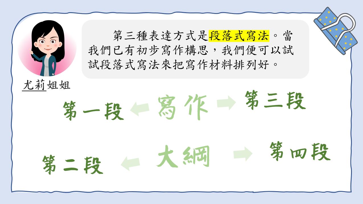 尤莉姐姐最近收到部份同學私訊。大家都不約而同地表示對「寫作大綱」無從入手。雖然同學們也明白寫作大綱沒有固定的格式,但我們又怎樣從「零」開始呢?因此,尤莉姐姐介紹了三種常見的表達方式,希望能對同學們有所啟發。
