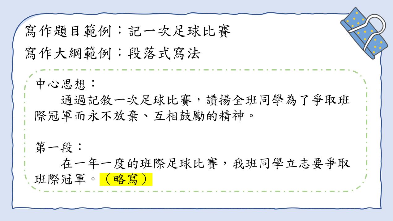 當我們使用這種「段落式寫法」時,還可以把寫作提示寫在段落旁邊。以下圖為例,我們便可以寫上「略寫」來提醒自己。在正式寫作時,便能活用這個寫作大綱了。