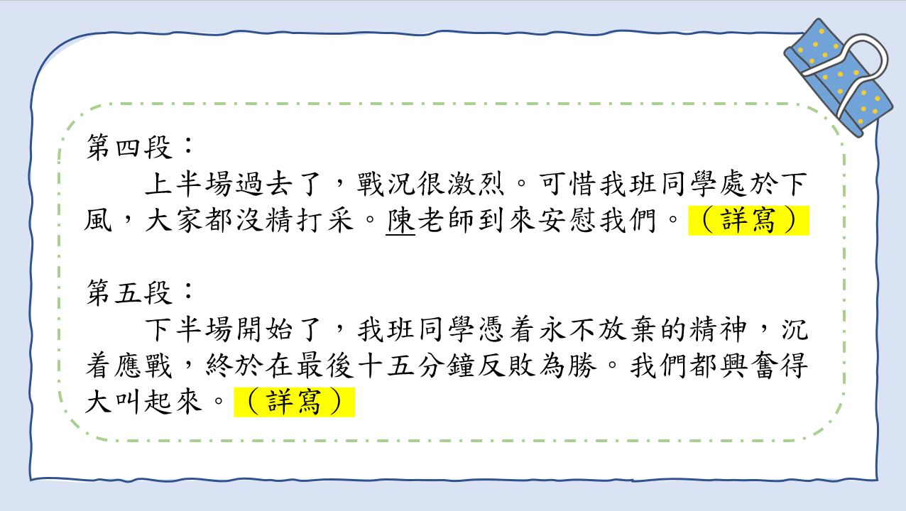• 第三段:女生們在球場旁邊走來走去,為我班同學打氣。男生們也在球場上互相提點,商討對戰策略。(詳寫)