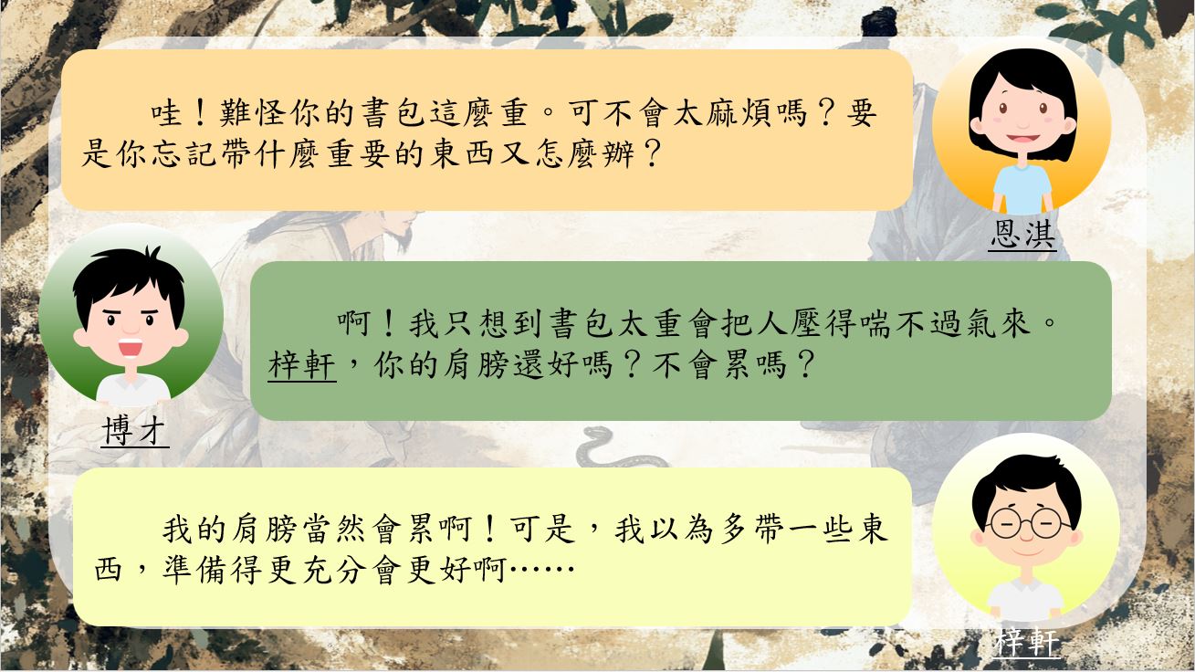 - 博才:「啊!我只想到書包太重會把人壓得喘不過氣來。梓軒,你的肩膀還好嗎?不會累嗎?」