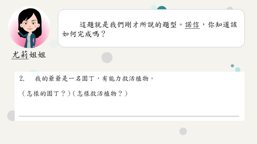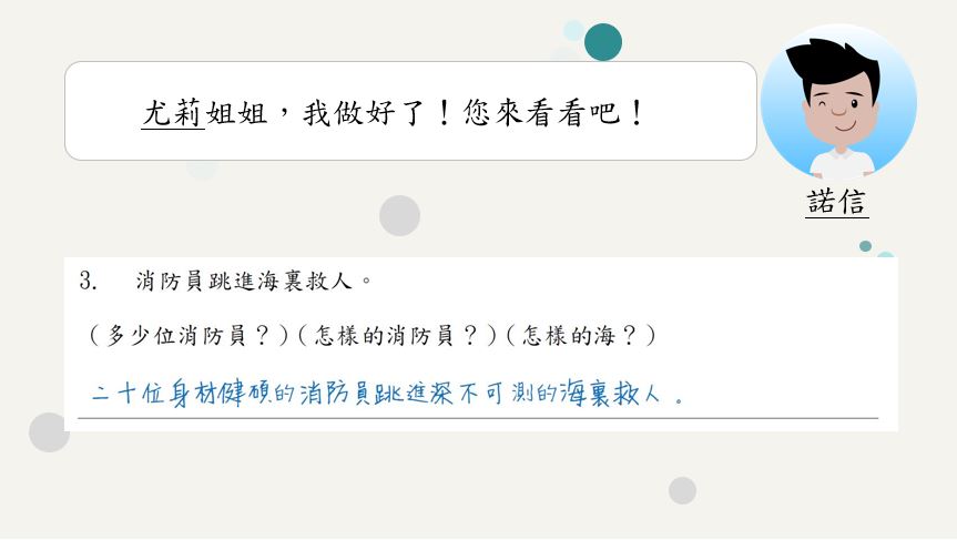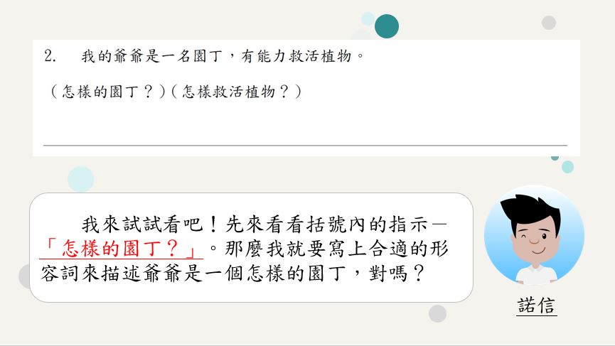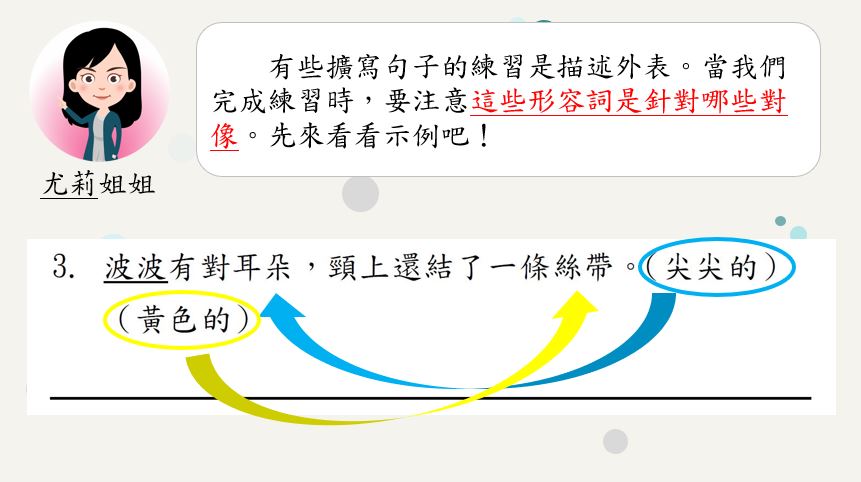 「擴寫句子」意即在簡短的句子上加入修飾補充的部份,而成為一句意思更圓滿的句子。當我們要完成擴寫句子的練習時,要注意我們思考的流程與要點。第一,我們要注意括號內的詞語;第二,我們要找出與句子內詞語的關聯;第三,使句子讀來通順流暢。